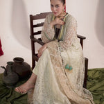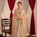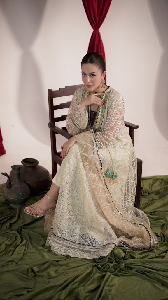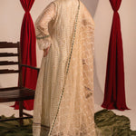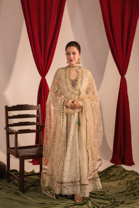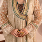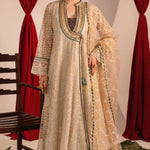 Elegant Ivory angarkha with exquisite Jamawar borders and intricate hand-embellished neckline, finished with dramatic tassels and embroidered laces that add a touch of grandeur.