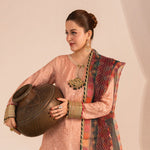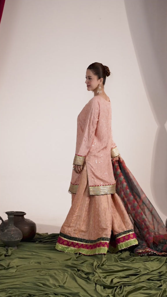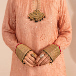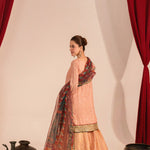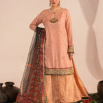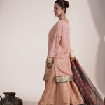 Exquisite cutwork straight shirt silhouette paired with a stunning Karandi Silk lehenga, featuring intricate hand-embroidery on the neck and an exquisite handmade tassel. The borders shine with sequins and gold and fuchsia fusions. The organza dupatta boasts digital prints in accent colors, adding a touch of elegance.