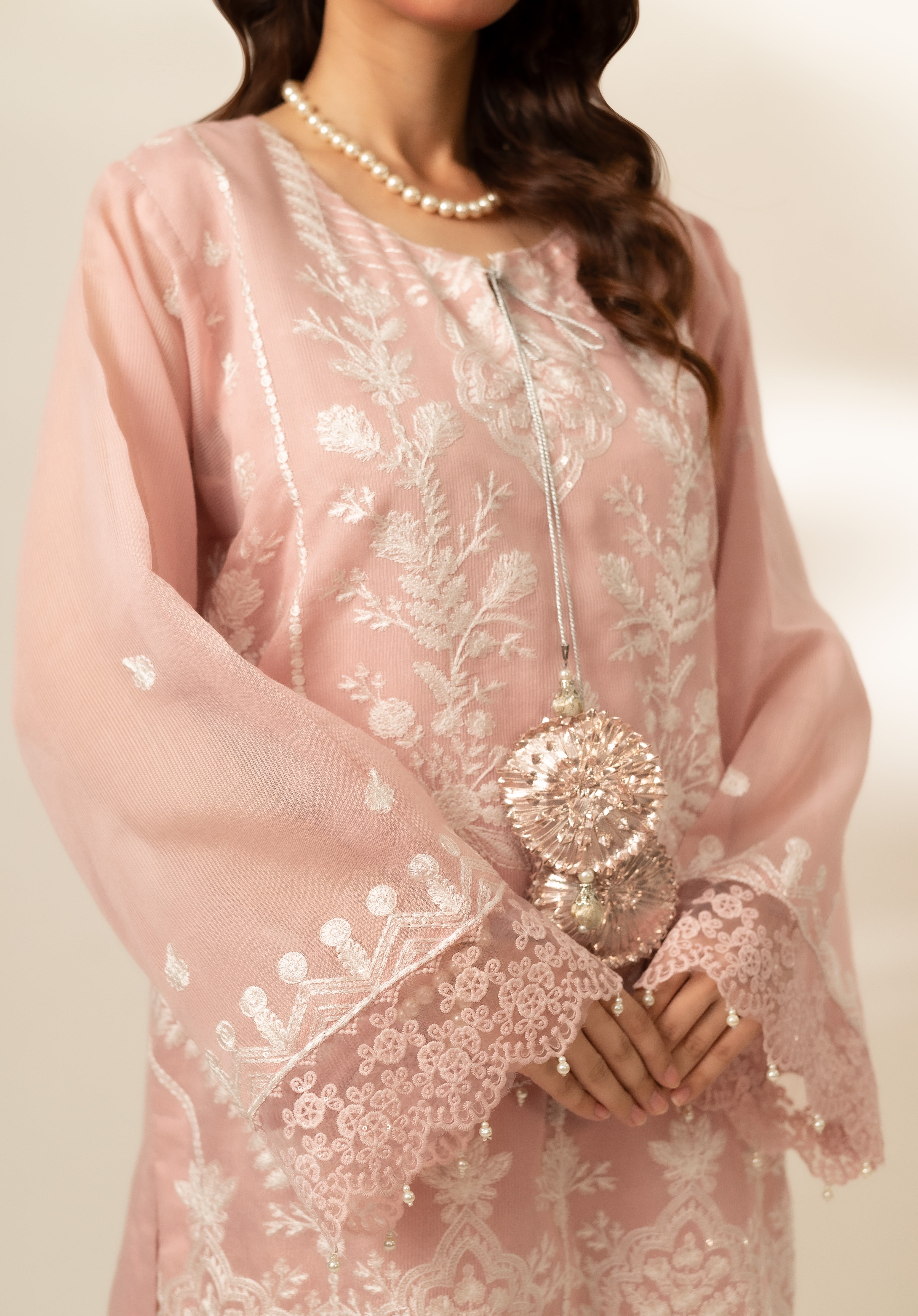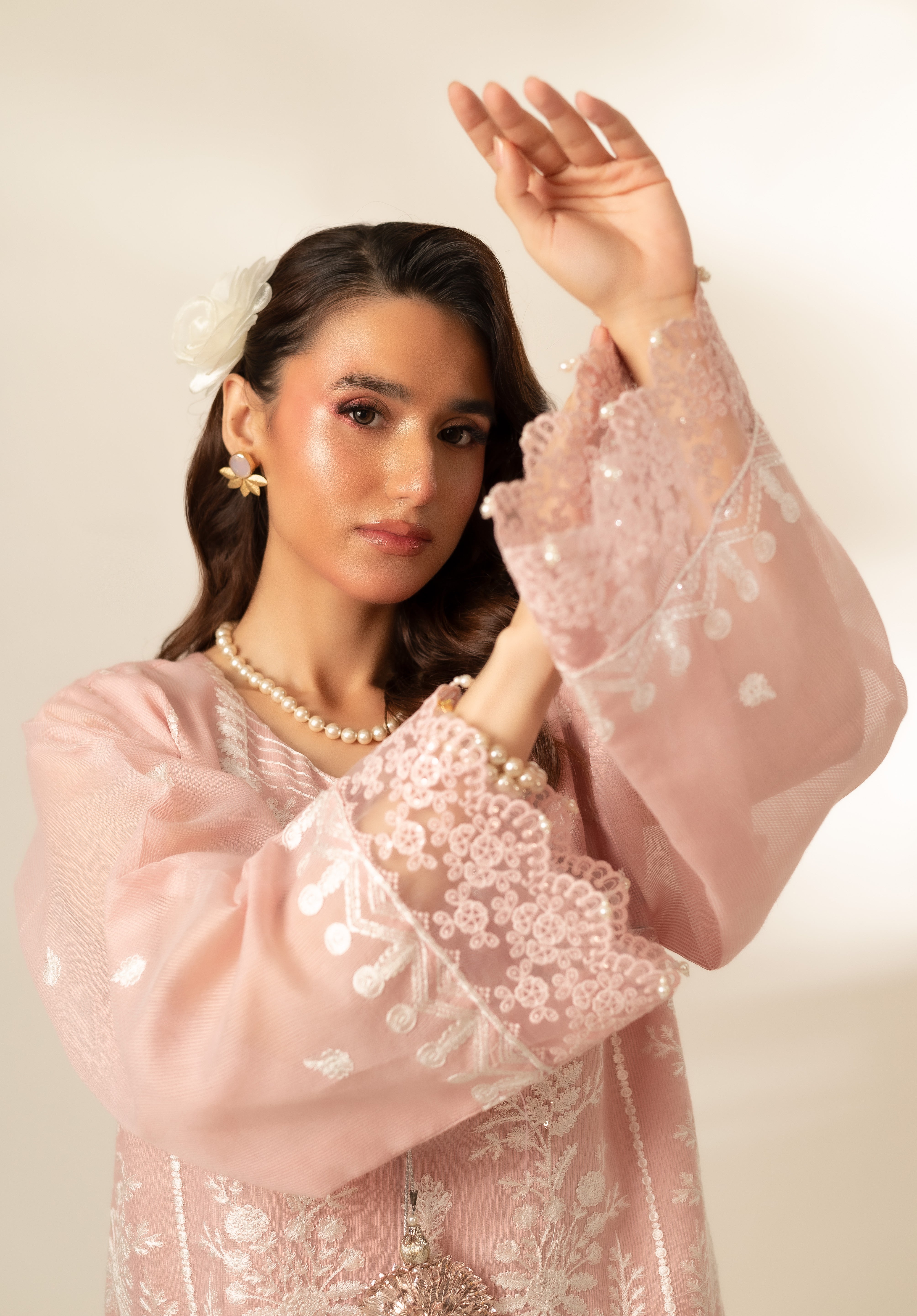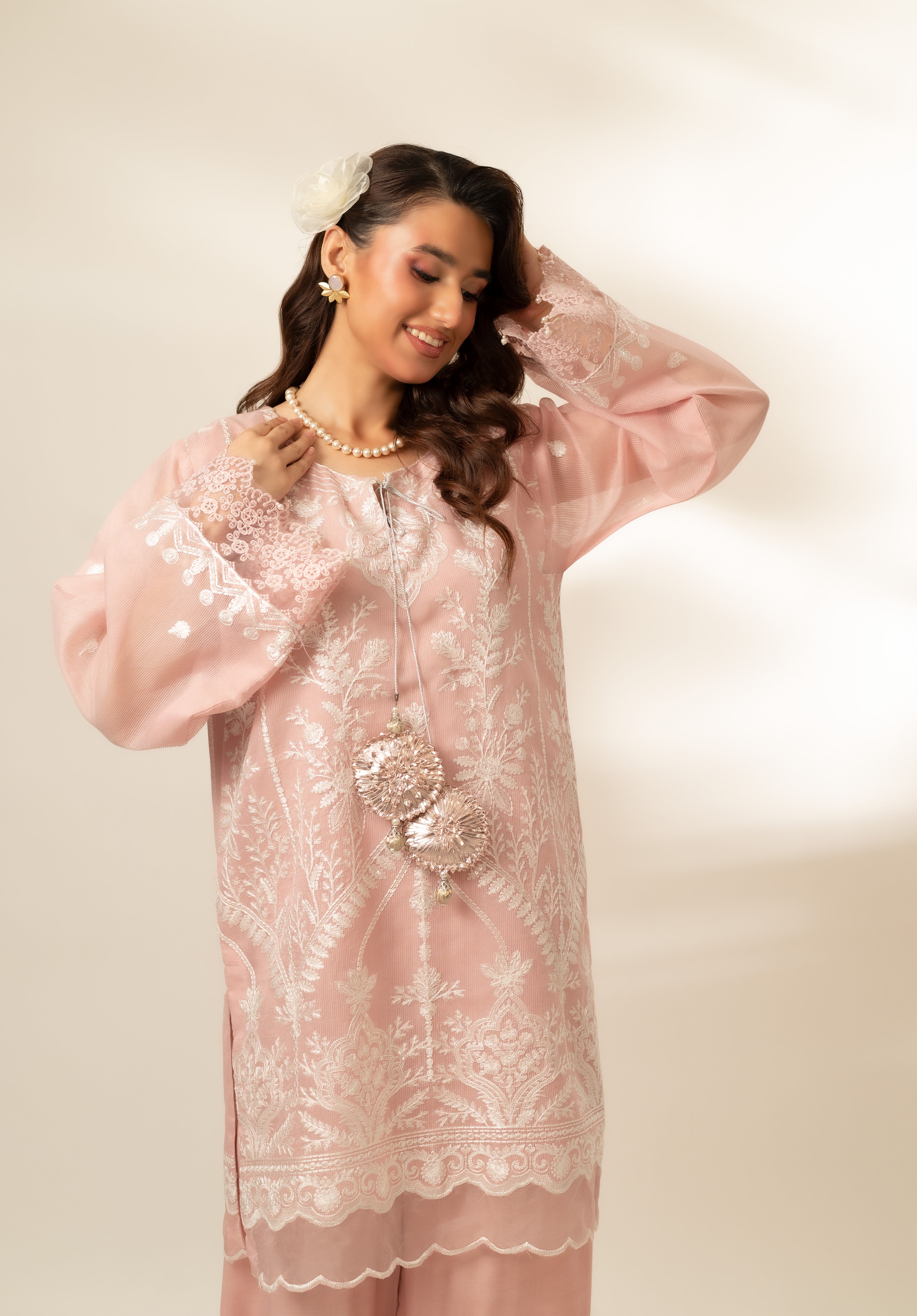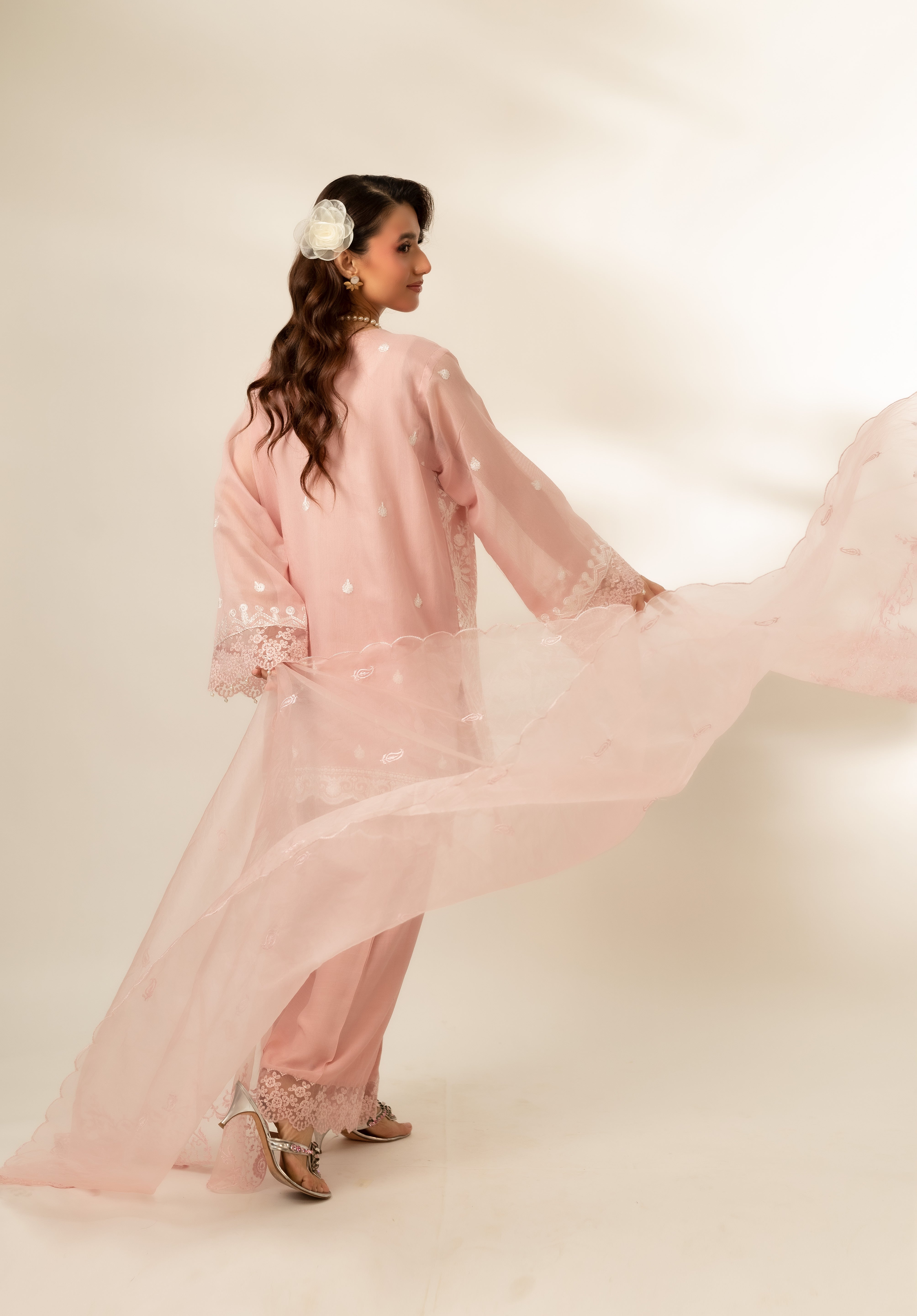 Make a statement in this beautiful pastel pink traditional outfit, featuring intricate embroidery and lace detailing. The elegant neckline with a dramatic gota tassel and embroidery on the front, paired with scalloped edges and matching wide-leg pants, create a sophisticated look. The embroidered organza dupatta adds a touch of grace, making it perfect for festive or formal events.
