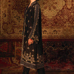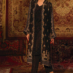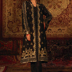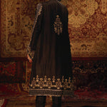 'Chandni Raat' is a contemporary raw silk front open jacket features stunning zardozi handwork in rich gold hues with accents of olive green resham and is finished with intricate pearls that creates a modern look. This alluring handwork is featured on the opening of the jacket, the borders are complimented with a modish arabesque jaal and finished with magnificent floral motifs on both sides. This jacket comes with an inner adorned with chan on it. The zardozi handwork is also delicately embellished on the sleeves that uplifts the look of this piece. This front jacket is finished with deep regal gold hue of banarsi finishing, creating a rich look of this design. This is paired with straight slit open black pants with loops finishing. The pouch can be made on customization as per order.