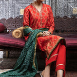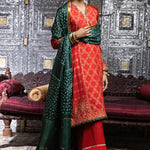 'Chunariya' is a straight shirt with intricate screen print and sequins with an overlapped hand crafted neckline with kora, dabka and gota. It is paired with matching culottes with lace and a contrasting chunri dupatta in emerald green with lace.