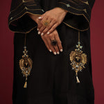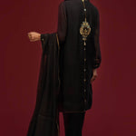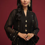 The beautiful black khaadi net serves as a canvas for, 'Crescent'. The classic kurta silhouette features gold and silver work on front, back and sleeves with lace and tassel detailing, for the perfect look, pair it with black lace shalwar and embroidered khaadi net dupatta.