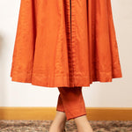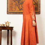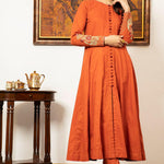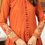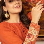 'Dahlia' is a trendy 1pc dress in rust with delicate zari and resham embroidery. It is paired with matching straight pants with contrasting lace and finished with over-all buttons.