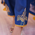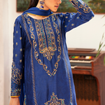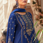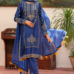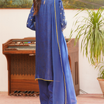 'Deniz', a same colored outfit which stands out in this blue jacquard straight cut shirt with persian themed hand embellishment done with zari, colored kora, dabka, sequin. The matching pk raw silk shalwar is made with hand embroidered motif and the chiffon dupatta is finished with handmade samosa tassels. The entire outfit is finished with ochre yellow finishings.