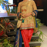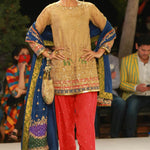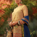 "Doli" is a straight cut elegant dress in gold tissue net that features delicate handwork with hues of green with motifs, elephants and trees along with red and blue applique borders that enriches the overall look of this appealing outfit which is delicately finished with gold finishing and delicate handmade dori tassels on the back. It is paired with red and tones of blue and green applique on the borders with green banarsi and heavily paired royal blue dupatta with hand work and Elephant motifs on borders that uplifts the overall look of this festive bridal wear. A beautiful pouch in gold with Elephant motifs brings out the overall extravagance of this ensemble.