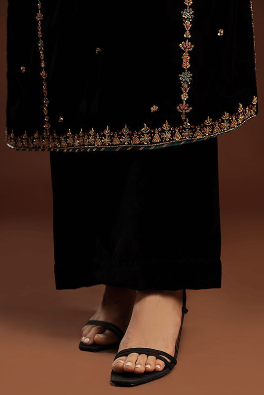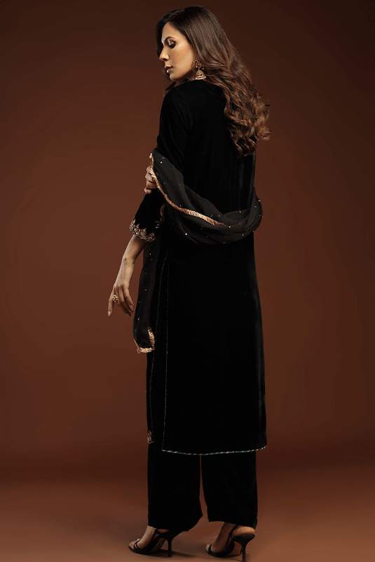 "Elnara A" is a black velvet long shirt intricately hand embroidered with contrasting coloured resham, dabka, kora, pearls and sequins. This outfit is paired with velvet Izaar pants and contrasting tissue silk two colored dupatta finished with black banarsi trimmings.