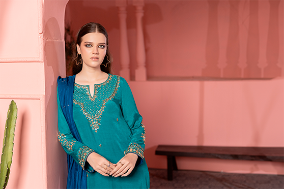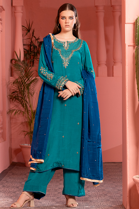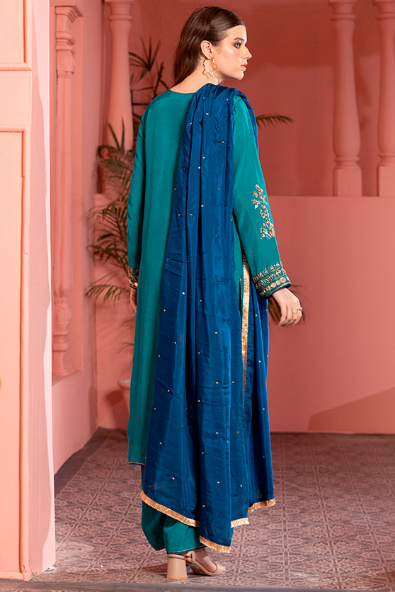 "Emma" is a long, green Pk raw silk shirt with an elegant round key hole neck and sleeves, intricately adorned with kora, dabka zari and aari, pearl, sequence and mirror work. The fitted sleeves and long silhouette giving a graceful look. It is paired with matching izaar and blue tissue silk dupatta with chan work and kiran finishing.