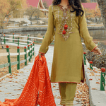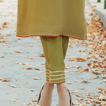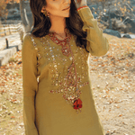 Esra is a straight dhaani green shirt paired with straight pants. It has intricate hand embroidery with ari, gota and accent of pink resham. The neckline is appliqued with pink color and dori tassels. This outfit is paired with a contrasting rust chunnri dupatta, finished with pink paltawa and lace.