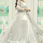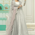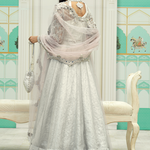 'Fara' is an absolutely gorgeous outfit with silver look over all. The stunning front open kalidar is rendered on a luxurious silver maysuri net fabric. It is embellished with crystals, gotta, zardozi and a complementing lilac resham. The dress is paired with a silver banarsi lehenga and an intricate lilac net dupatta with zardozi and mirror worked tassels.