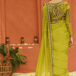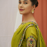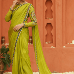 Gul e chandni is a tissue silk saree that comes with intricate embroidered border in hues of magenta and teal finished with gold laces in hues. It is complimented with a matching blouse in raw silk with handwork at the back and sleeves.