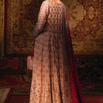 Gul-e-Rana ensemble epitomises the whimsical grace of a traditional bride. A long silk blush pink kalidar frock contrasted with a subtle shade of fuschia pink. The bodice is fully rendered with floral jaal handcrafted with champagne and silver kora, dabka and complemented with a beautiful shade of fuschia pink resham. A delicately adorned neckline with floral vines climbing up the front of a flared kalidar frock which makes a perfect fusion of modern with ethnic. The flared kalidar is accentuated with appliquéd fuschia pink mehrab all over the border of the heavy ghair, which makes up to this royal ensemble. It is complemented with a flared Dhaka style pajama with an overall delicate border with chan and bootis.