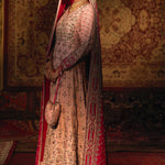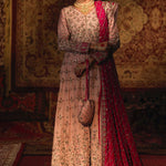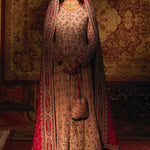 This elegantly flowing silhouette in soft blush pink with fuchsia accents, is paired with silk heavily adorned fuschia pink duppatta beautifully encrusted with delicate flowers and silver filigree. It’s embellished with a heavy matha-pati border all intricately handcrafted with the technique of appliqué work.