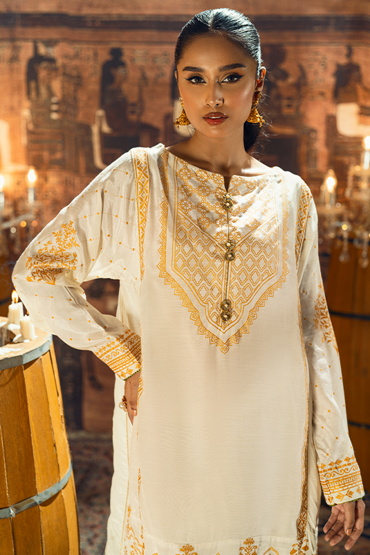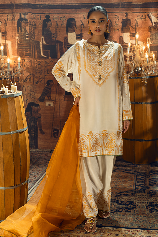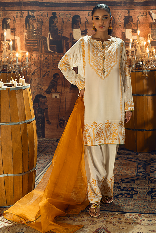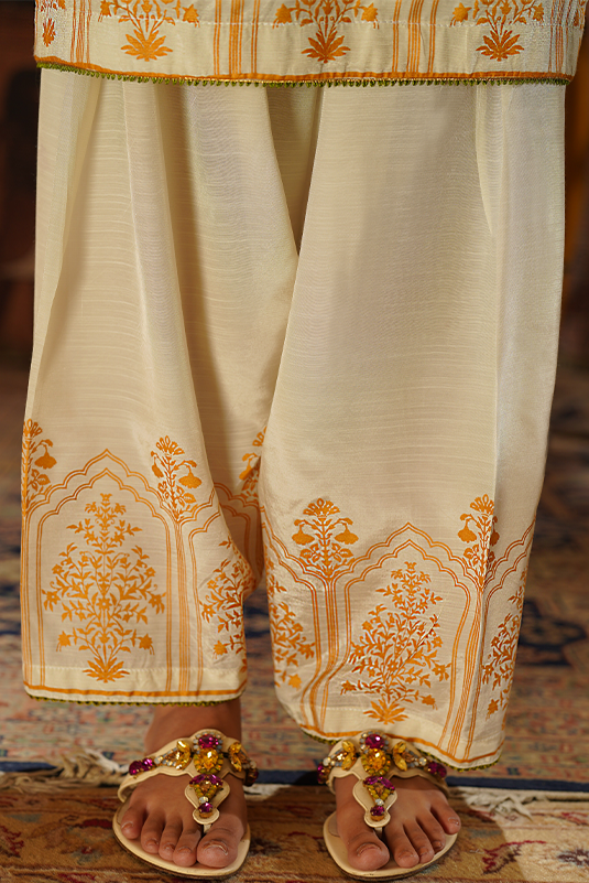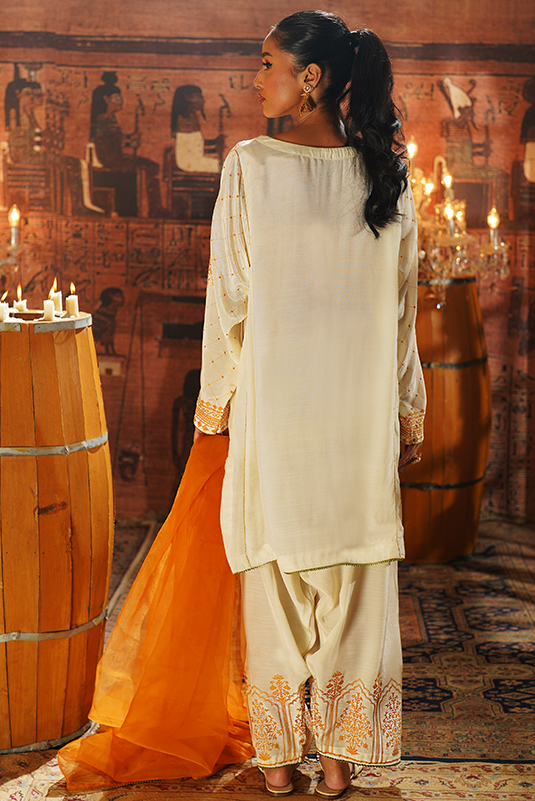 "Hedya" is an ivory pk raw silk kurta enhanced with alluring screen print on the front and sleeves. Neckline finished with gota flower and pearls on top of it. It is paired with matching shalwar and contrasting rust coloured organza dupatta with gotta detailing on borders.