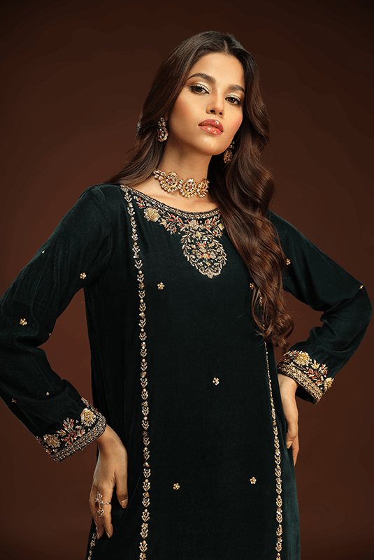 "Ilhaam" an emerald green classic silhouette in Velvet. The shirt features intricate hand embroidery including resham, dabka, kora, pearl and sequins work. It is paired with banarsi green pants and matching chiffon duptta finished with gold lace trims.