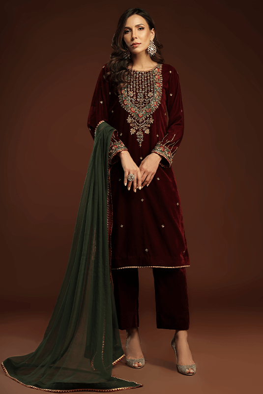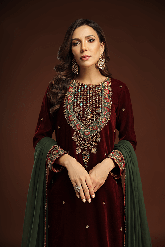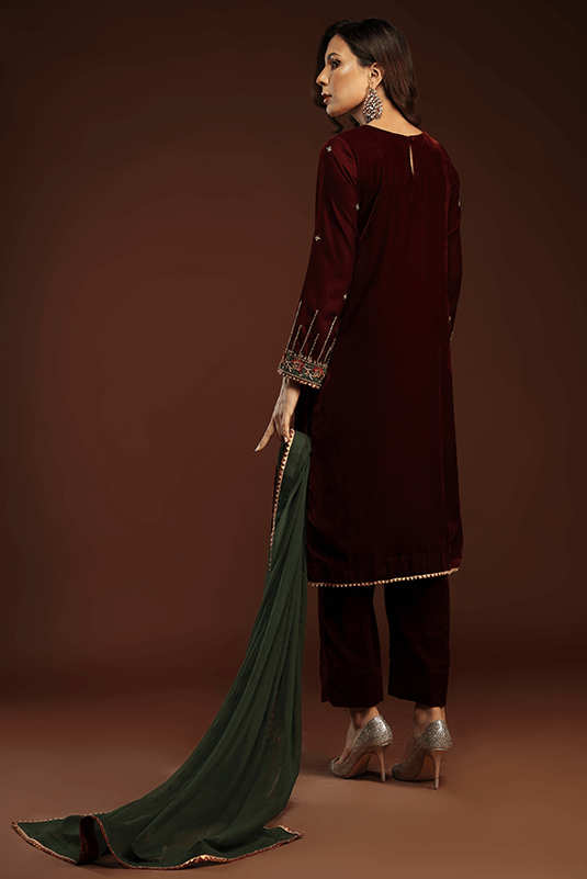 "Inza" is a maroon shirt with hand embroidered neckline detailed with contrasting applique. It is further embellished with resham, dabka, kora, pearl and sequins. It is paired with matching velvet pants and a contrasting green chiffon dupatta, which complement the ensemble.