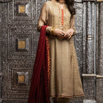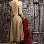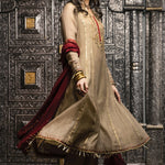 'Jhoom' is a flarely pishwas with intricate gota, kora and dabka work on the neckline. The beautiful dress is embellished with gold laces and with maroon banarsi. The flared paneled frock is complemented with beige raw silk straight pants and a maroon chiffon dupatta.