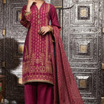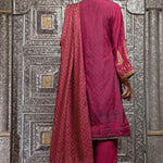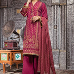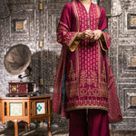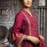 'Jugni' is a gorgeous berry pink raw silk straight shirt that is adorned with hand embroidered touchings to highlight the festive gold screen-printed motifs on the sleeves along with stunning screen printed borders in gold that highlights the overall look of this dress. It is paired with a raw silk pink izaar that is highlighted with the finishings along with a tissue silk dupatta in berry pink with a screen printed jaal that makes this whole dress a perfect wear for this festive occasion.