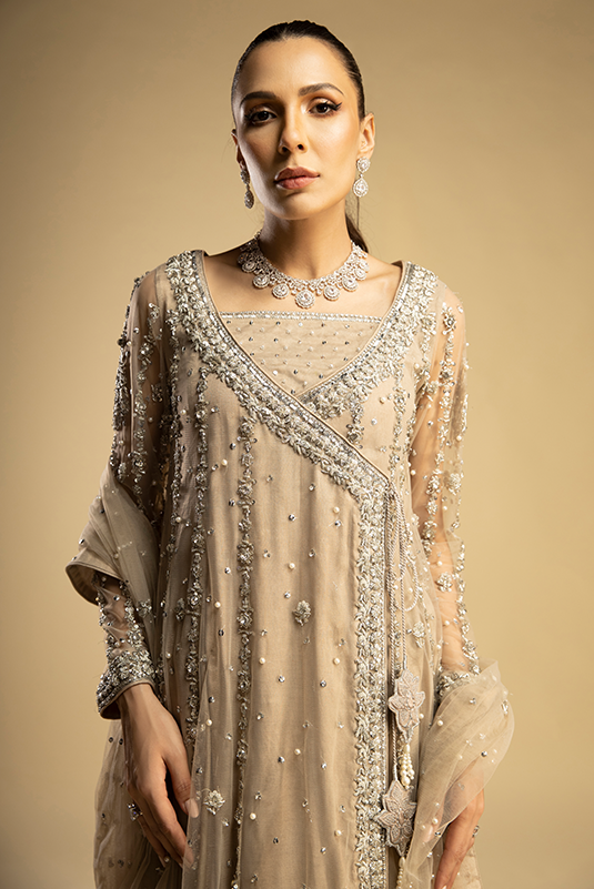 "Kashaf" is a floor length kalidaar angrakha on a dreamy beidge net canvas featuring detailed and intricate kora, dabka, zari, sequins and pearls work. It is paired with matching dhaka pajama, hem finished with silver cutwork and matching net dupatta with sequins and pearls over all.