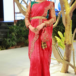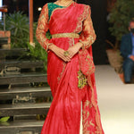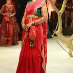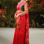 "Kesariya" is a red double tone raw silk saari with delicate handwork on pallu consisting of zardozi and aari work with aesthetically composed floral and figurative motifs. The saari border and rust tissue sleeves are hand embroidered with scallop cut work in contrast to the simple yet elegant green banarsi blouse, embellished with fabric buttons at the back finished with red banarsi finishing. The saari comes with a red petticoat and a hand embroidered, scallop cut work rust pouch.