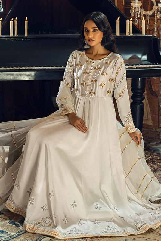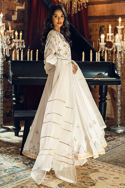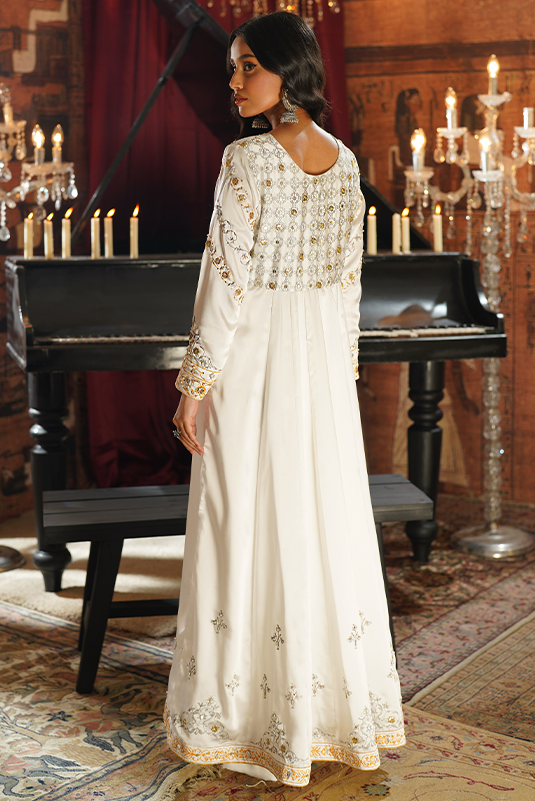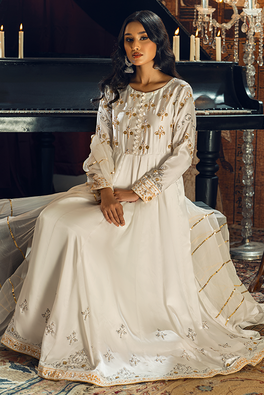 "Khonsu" is a white silk peshwas featuring gold and silver screen print. Bodice, sleeves and hemline are embellished with pearls, gota flowers, dabka, crystals and zardozi work. It is paired with a matching silk Izaar and chiffon duaptta enhanced with gold squins and finishings.