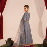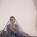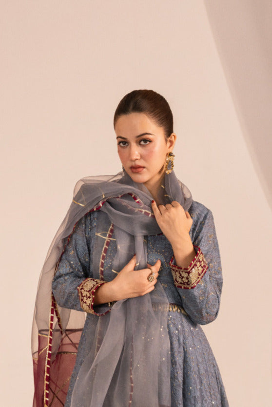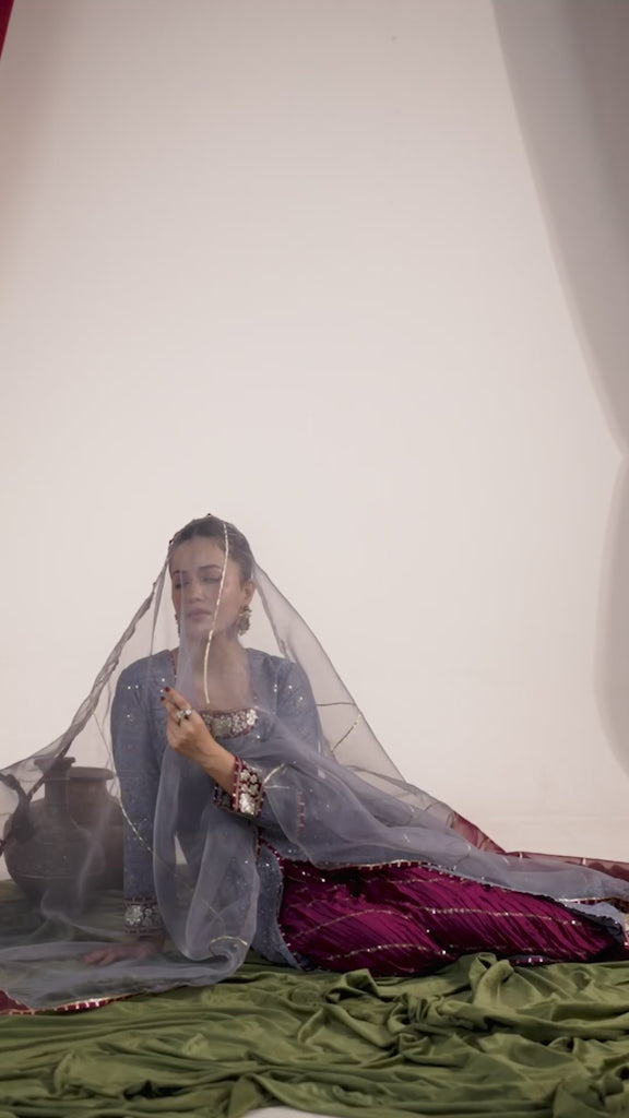Exquisite lavender ensemble featuring intricate Chikankari embroidery, paired with a stunning Fuchsia Pink embroidered crushed lehenga and a double-colored Organza dupatta. The bodice boasts a delicate hand-embellished lace with pear droplets, adding a touch of luxury.