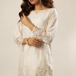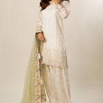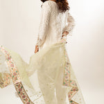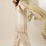 Dazzle in this stunning off-white ensemble, adorned with intricate embroidery, delicate lace details, and exquisite applique work with beads. The shalwar complements the beautifully embroidered kurta, while the light green organza dupatta features a stunning block-printed border, adding a touch of sophistication and whimsy.