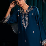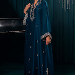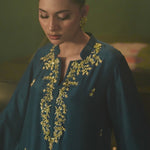 A rich teal-blue kaftan with luxurious hand embroidered neckline, adorned with hand- sequins, dabka, kora, and beadwork. Screen print finishing adds texture and sophistication.