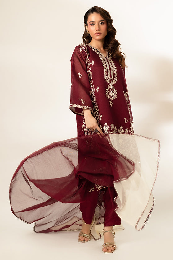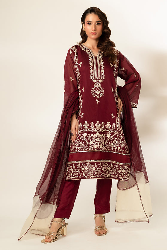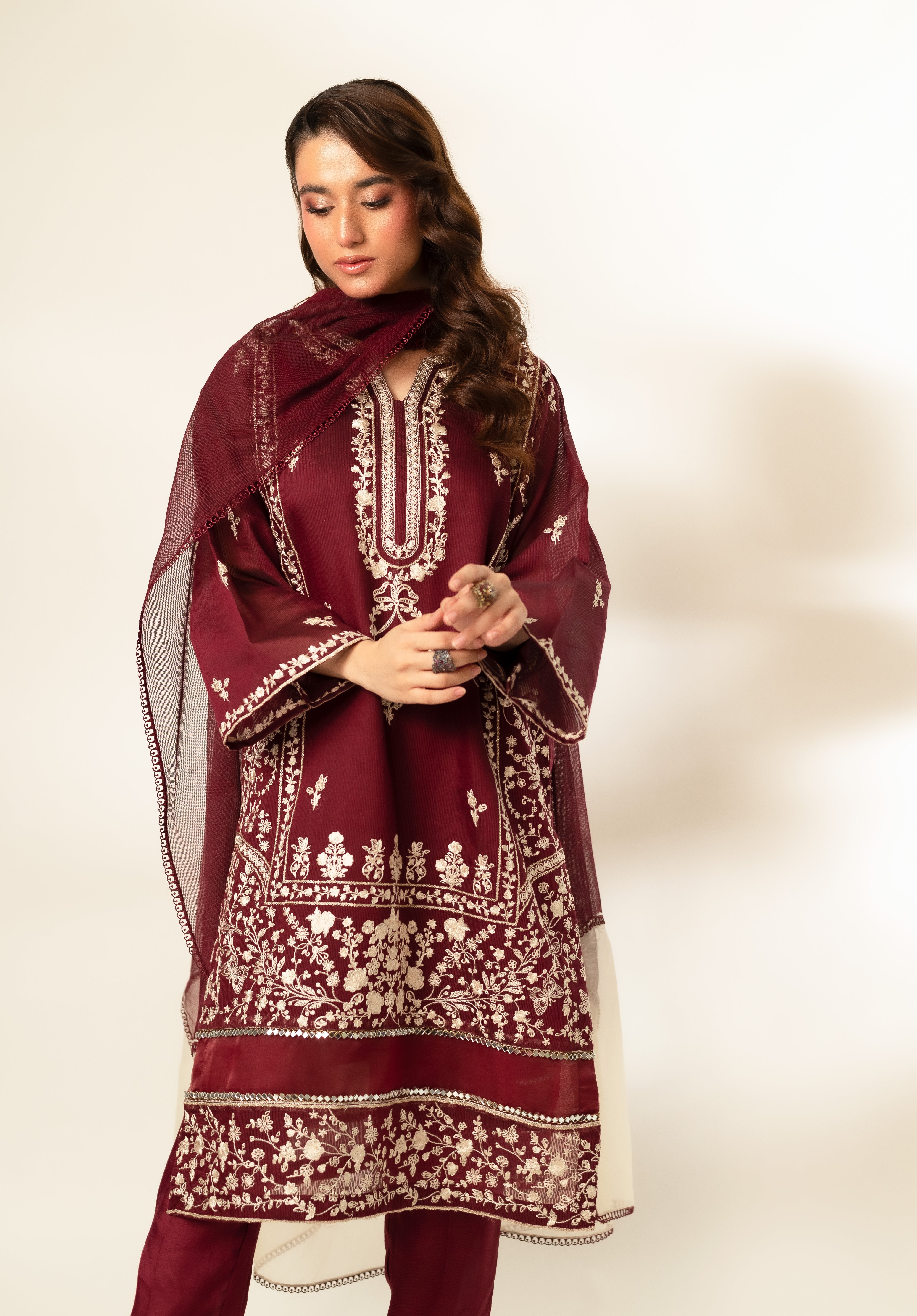 Exude regal elegance in this stunning maroon traditional outfit, adorned with intricate machine embroidery throughout the fabric. The long kurta boasts a detailed neckline and decorative patterns on the hem and sleeves, adding a touch of sophistication. Paired with matching maroon pants and a sheer, two-toned organza embroidered dupatta, this ensemble is perfect for festive and formal occasions.