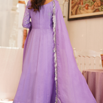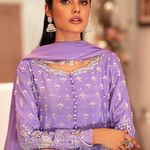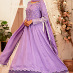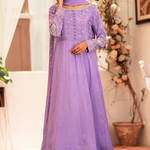 'Mayumi' lavender pk raw-silk peshwas features intricate hand embroidery on the bodice. Scalloped neckline, embellished buttons and pearls on center front. The hem is adorned with scallops along with an organza border. The ensemble is paired with matching pk raw silk straight pants and a tissue silk dupatta, decorated with a lace border.