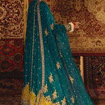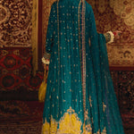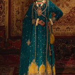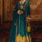 'Mehr Bano' has an exquisite harmony of color and pattern. Adorn yourself in this beautifully crafted ferozi angharka with intricate hand work of mehrab and floral motifs paired with a matching organza dupatta with heavy zardozi. This outfit is complimented with an accent applique in lime green and purple finshing. This outfit is paired with a banarsi silk churidar pajama and a handcrafted contrasting pouch to complete the look.
