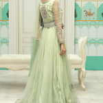 A reflection of delicate grace, 'Naaz' is a net mint green and light pink lehenga choli made with exquisite handwork in silver and applique work. It is paired with a light double shaded net dupatta with handworked mathapati. This outfit is finished with pearls and handmade tassels.