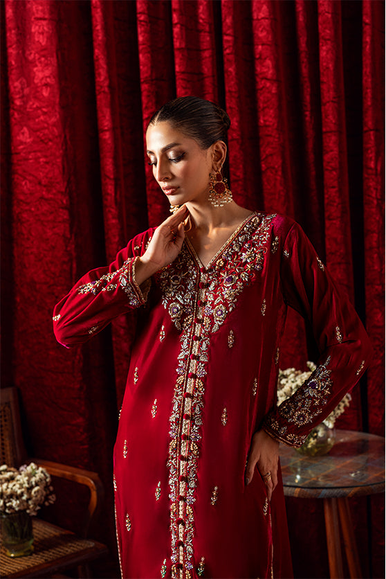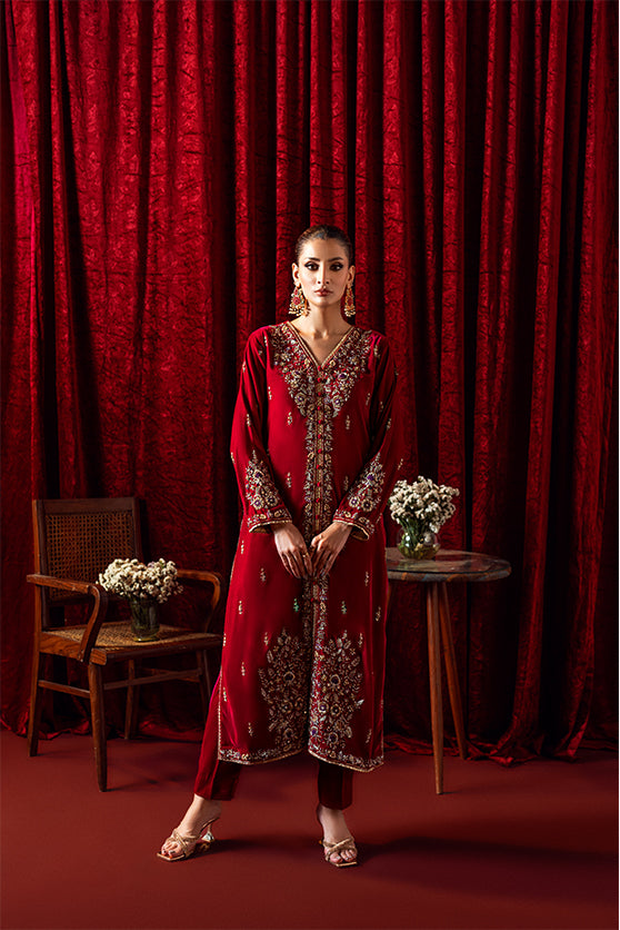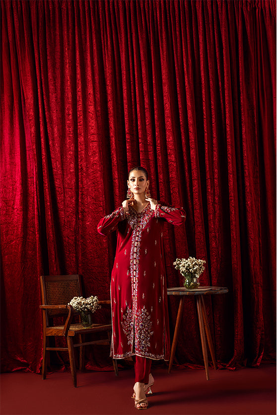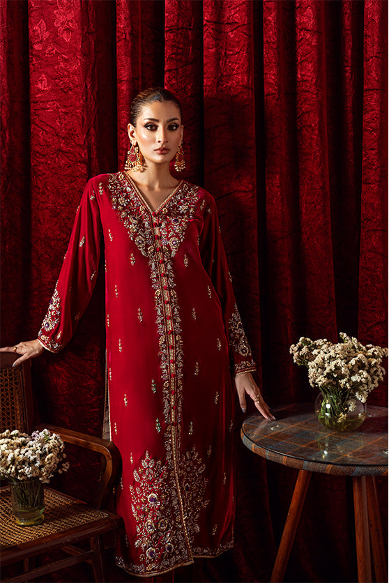 "BLUSH BLOSSOM" It is a beautiful long, pink velvet shirt with an elegant hand embroidery, intricately adorned with kora, Dabka zari and Aari, pearl, sequence and Resham work. The long silhouette giving a graceful look. It is paired with matching straight pants.