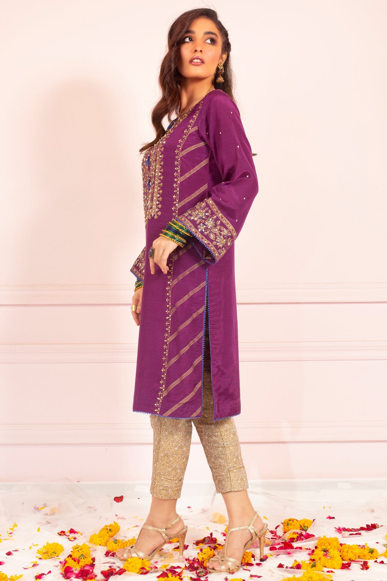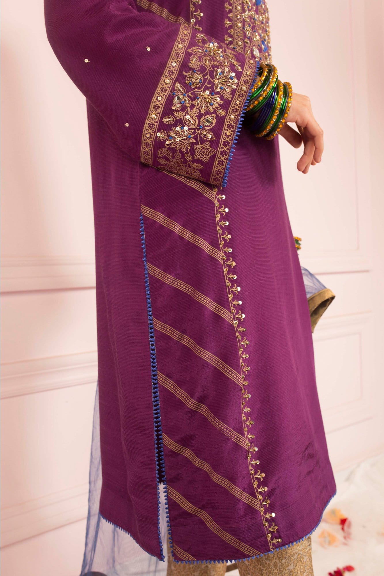 'Nikhar' is an exquisite gold screen printed raw silk ensemble in rich hues of purple which is delicately hand embroidered to bring out its festive look in kora, dabka, sequence work and indigo hues in the form of tassels, to wear this festive season. It is paired with a delicate indigo net dupatta adorned with intricate handwork and chan/booti and gold banarsi trousers. It is a beautiful straight cut silhouette which is perfect for any occasion.