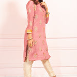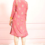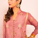 'Palki' is a chic and classy raw silk kurti in blush pink with rose gold booti screen print. It has hand work of gold with accents of maroon and orange resham to balance the theme of the shirt with an orange banarsi lace and fancy buttons on the neckline.