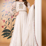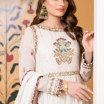 'Pankh' is a long pishwas in white khaddi net with delicate handwork on bodice and sleeves with contrasting resham. It is paired with a matching khaddi net dupatta and white banarsi churidar. The outfit is finished with pink lace, pearls, and green banarsi.