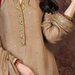'Pareesa' A classy outfit in beige color with accents of deep reds to flawlessly balance the theme of the outfit. Improvising detailed work on the overlap neckline and on sleeves border and a spray of sequins all over the shirt and pure silk dupatta detailed with the lace on four sides of the dupatta. This ensemble is perfect for pre-wedding events.