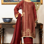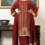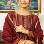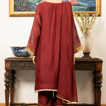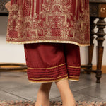 ‘Petunia’ is a simple yet classy khaddi net outfit in maroon with detailed gold screen print and fancy buttons. It is paired with matching khaddi net dupatta and embellished culottes.