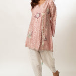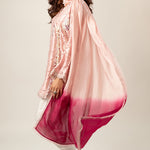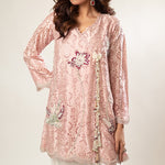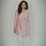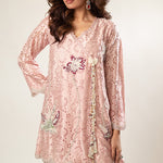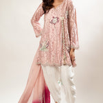 Blush in romance with this soft pink masterpiece, featuring intricate thread embroidery, sequin embellishments, delicate handwork on the neckline, and hand-crafted appliqué flowers with beads. The white tulip pant and double-shade tissue silk dupatta with a dramatic floral border complete the look, exuding timeless elegance and refinement.