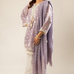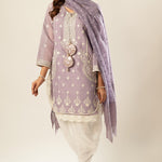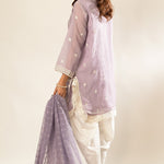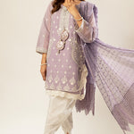 Enchant in this lavender masterpiece, boasting intricate white and silver detailing on the embroidered kurta. The neckline features oversized Gota tassels for some drama, while the khaadi net dupatta is adorned with elaborate lace, adding a touch of sophistication.