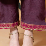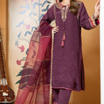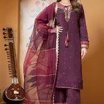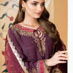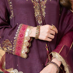 'Ranjhana' is a beautiful plum rawsilk outfit with detailed handwork on neckline with tassel, sleeves, and shalwar. In a loose-cut silhouette, the shirt is adorned with applique with handwork. It is paired with a matching shalwar and two-toned appliqued dupatta in organza. The outfit is finished with kingri lace and scallop lace.