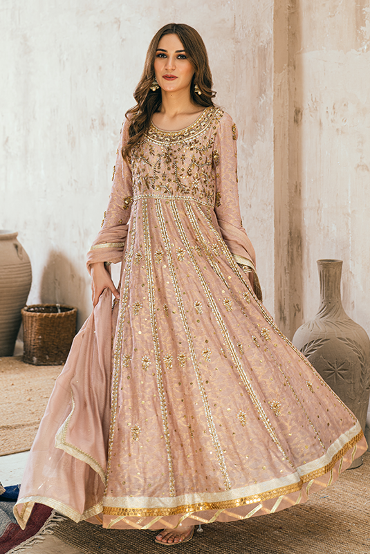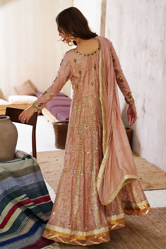 'Ranya' is a cotton net nude pink kalidaar with detailed hand embellishments comprising of dabka, naqshi, sequence, mukesh, gota, pearl and diamantes work. It is paired with matching pk rawsilk choridar and a matching cotton net dupatta with chan spread over all finished with gota lace with golden banarsi trimmings.