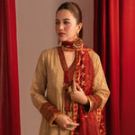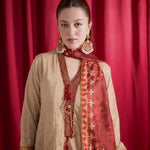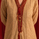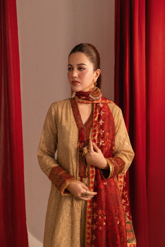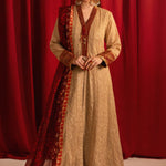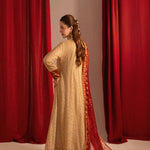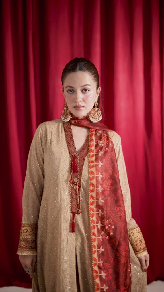 Elegant front-open Chikankari kalidaar with exquisite hand-embellished neckline. Paired with a stunning printed dupatta featuring intricate handwork. The ensemble is elevated by majestic ruby Jamawar borders and luxurious gold finishings, adding a touch of sophistication and glamour.