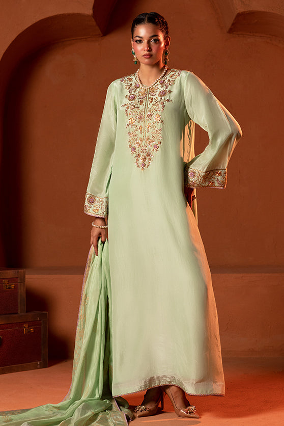 Exude sophistication in our mint green ensemble, featuring a long A-line shirt adorned with intricate sequin, dabka, kora, cut dana, and pearl embroidery. Paired with straight pants and a tissue silk dupatta with screen print detailing, this outfit blends tradition with modern elegance.