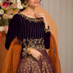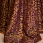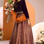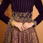 ‘Sehen’ is an exquisite deep purple ensemble in a classic lehenga silhouette. This outfit features a velvet hand embroidered choli and a purple banarsi lehenga finished with lace and contrasting rust finishing. It is paired with a contrasting rust organza dupatta with chan, lace and banarsi finishing.