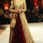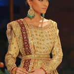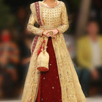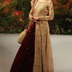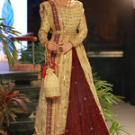 The combination of gold and maroon bridal is a symbolic of love and celebration. Heavily embellished with detailed handwork with resham & zardozi on a maysuri net and velvet base. A floor length velvet lehenga with handwork on border and maysuri net dupatta complete the regal look for the bride.