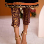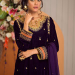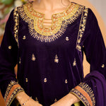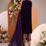 'Shajar' is a sophisticated straight cut ensemble in deep purple hues of velvet adorned with intricate handwork of kora, dabka and aari. The contrasting orange and lime green appliqué defines the overall look of this dress and highlights the handwork. It is paired with a straight banarsi trousers and features a stunning chiffon dupatta ornamented with chan and velvet finishing in deep purple which is perfect for festive wear.