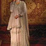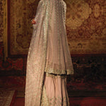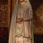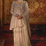 A dusty lilac net angrakha, 'Shehr Bano' is deftly adorned with delicate silver zardozi and rendered in glowing silver kamdani, incorporated all over the angarkha and complemented with an accent of elegant shade of ice blue resham. The luxurious bridal is lavishly scattered with seed pearls placed intricately on each kali and a beautiful hand crafted gota tassel doori complementing the heavily embellished neckline. The mid length angrakha is finished with a complementing banarsi in the shades of silver Zari, ice blue and lilac.