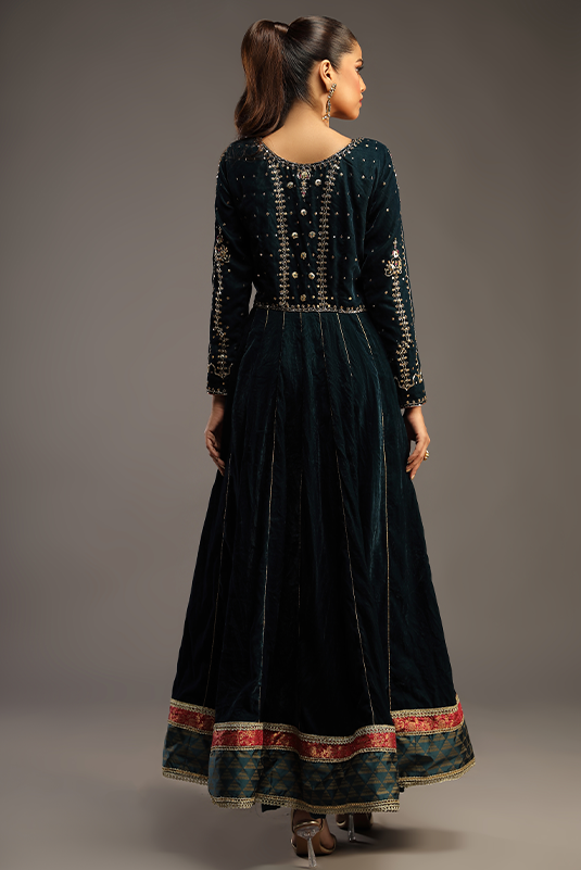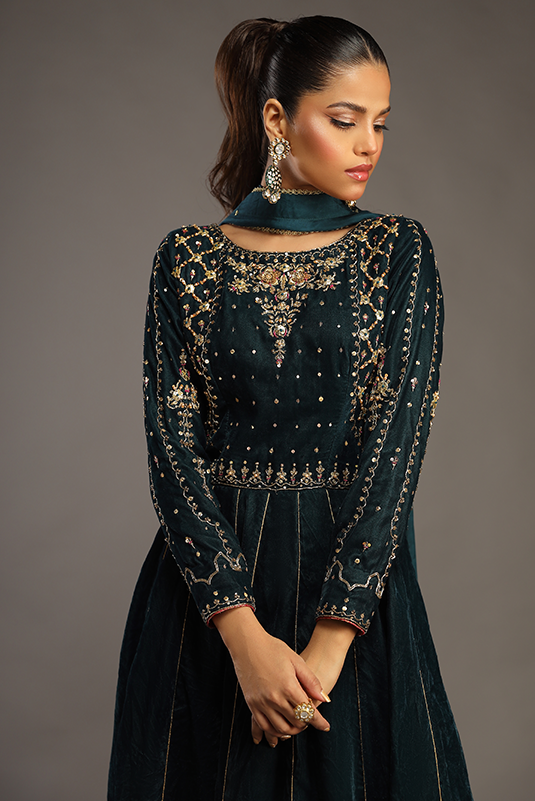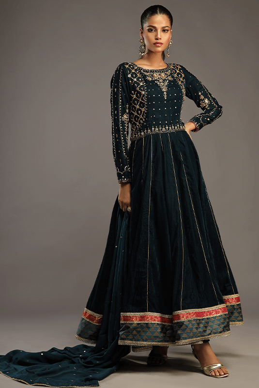 "Sibel" is a teal velvet long peshwas adorned with delicate handwork detailing of resham, kora, dabka, pearl, gotta and sequins. The hemline has a screen printed border of banarsi with gold lace trims. It is paired with matching banarsi pants and tissue silk dupatta with sequins details.