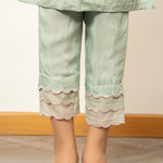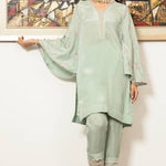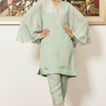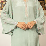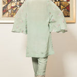 'Snowdrop' is a ice blue pk raw silk shirt stylized with a scalloped organza neckline and embroidered flared sleeves paired with scalloped straight pants to give you a light airy feel perfect for this season.