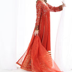 Rustic Romance Peshwas is a stunning outfit featuring a rich rust chiffon fabric with intricate kora, dabka and beadwork hand embroidery on the bodice, paired with a dramatic border adorned with gota finishings. The maroon accent is beautifully complemented with Jamawar details, adding a touch of elegance to this festive wear. The duppatta is fully embroidered with sequins work.